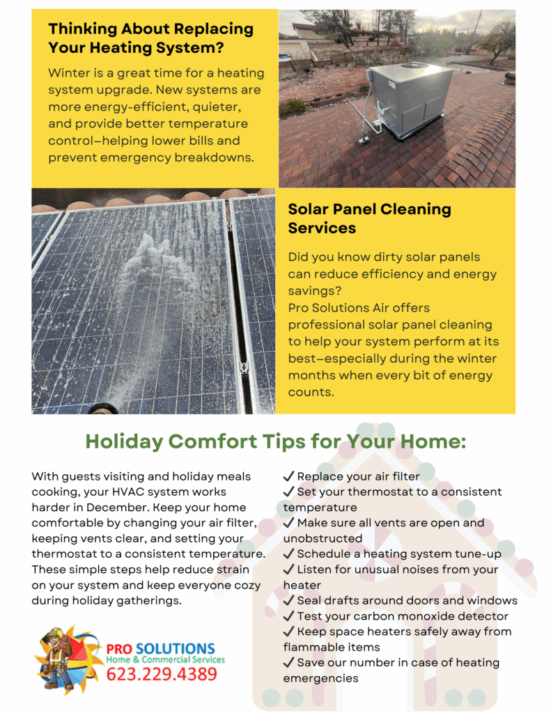 air conditioning services Arizona HVAC company commercial HVAC services December HVAC newsletter end of year HVAC check Energy Efficient HVAC heating and cooling Heating system efficiency holiday home comfort Home comfort solutions HVAC maintenance plans HVAC services HVAC system care Indoor air quality Pro Solutions Air Residential HVAC services seasonal HVAC maintenance trusted HVAC professionals winter HVAC tips Share This Previous Post← New Year, Reliable Home Heating in Wittmann, Wickenburg & Morristown, AZ New Year, Reliable Home Heating in Wittmann, Wickenburg & Morristown, AZ Next PostJanuary Comfort in Wickenburg, AZ: Don’t Ignore Your Heating System This Winter → January Comfort in Wickenburg, AZ: Don’t Ignore Your Heating System This Winter You May Also Like ac installation ac maintenance ac repair AC Tune-Up Tips Surprise Heat Prep View Post Furnace Maintenance Furnace Repair heating services HVAC contractor Tips Winter HVAC Tips 5 Ways to Keep Your Home Cozy Without Overworking Your Heater View Post ac installation Furnace Replacement Package Unit Replacement Replacing an Air Conditioning & Heating System- Glendale, Arizona View Post